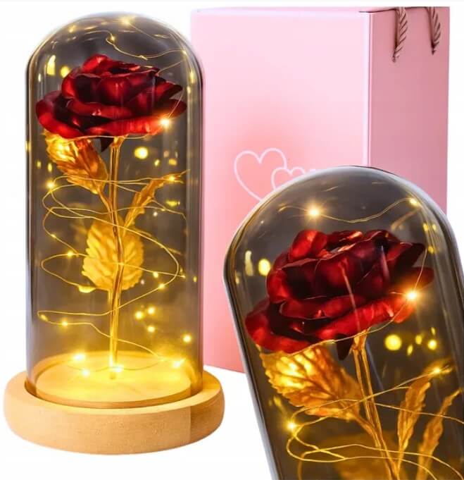 Elegancki klosz chroni różę przed kurzem i sprawia, że prezent wygląda luksusowo.